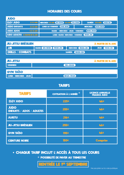 Les disciplines ![]() Horaires et cours ![]() Les profs ![]() Inscription & Tarifs ![]() Nos coordonnées ![]() Venir au dojo ![]() Nous écrire ![]() |
